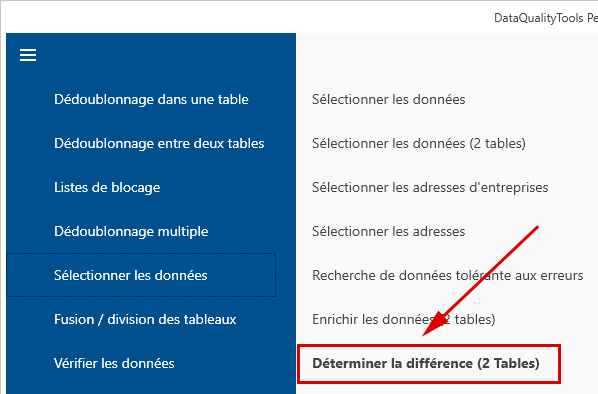 - La fonction dont nous avons besoin se trouve dans le menu, dans le bloc "Sélectionner les données". Sélectionnez "Déterminer la différence (2 Tables)":